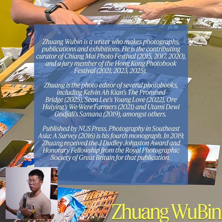 ZHUANG Wubin is a writer who makes photographs, publications and exhibitions. He is the contributing curator of Chiang Mai Photo Festival (2015, 2017, 2020), and a jury member of the Hong Kong Photobook Festival (2021, 2023, 2025). Zhuang is the photo editor of several photobooks, including Kelvin Ah Kian’s The Promised Bridge (2025), Sean Lee’s Young Love (2022), Ore Huiying’s We Were Farmers (2021) and Utami Dewi Godjali’s Samana (2019), amongst others. Published by NUS Press, Photography in Southeast Asia: A Survey (2016) is his fourth monograph. In 2019, Zhuang received the J Dudley Johnston Award and Honorary Fellowship from the Royal Photographic Society of Great Britain for that publication. .