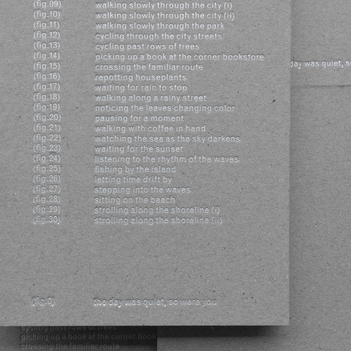 A quiet record of solitary rhythms and unspoken moments, made of brief glimpses of strangers passing through everyday spaces, each carrying their own world.